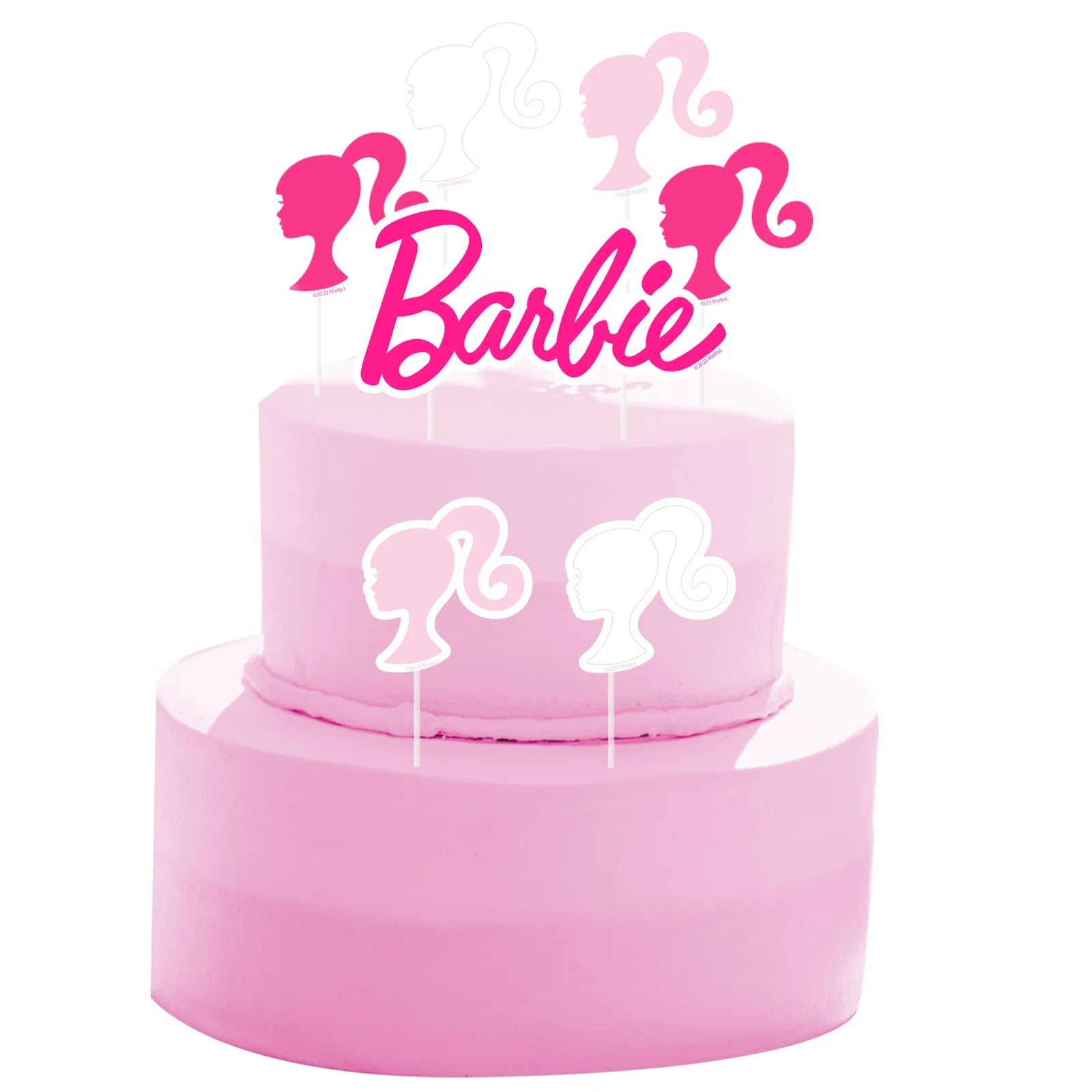 Pack of 7 Barbie Cake Toppers. Pink and White cake decorations shaped like an outline of Barbie's head.