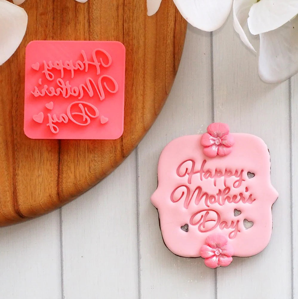 The 3D printed stamp is perfect and fun way to make Mother's Day gifts and treats. The stamp is on a backing plate that is a 6cm square. It features the words "Happy Mother's Day" with a couple of hearts. The design is approximately 5.5cm wide x 5cm high with a detailed imprint depth of 0.4cm.