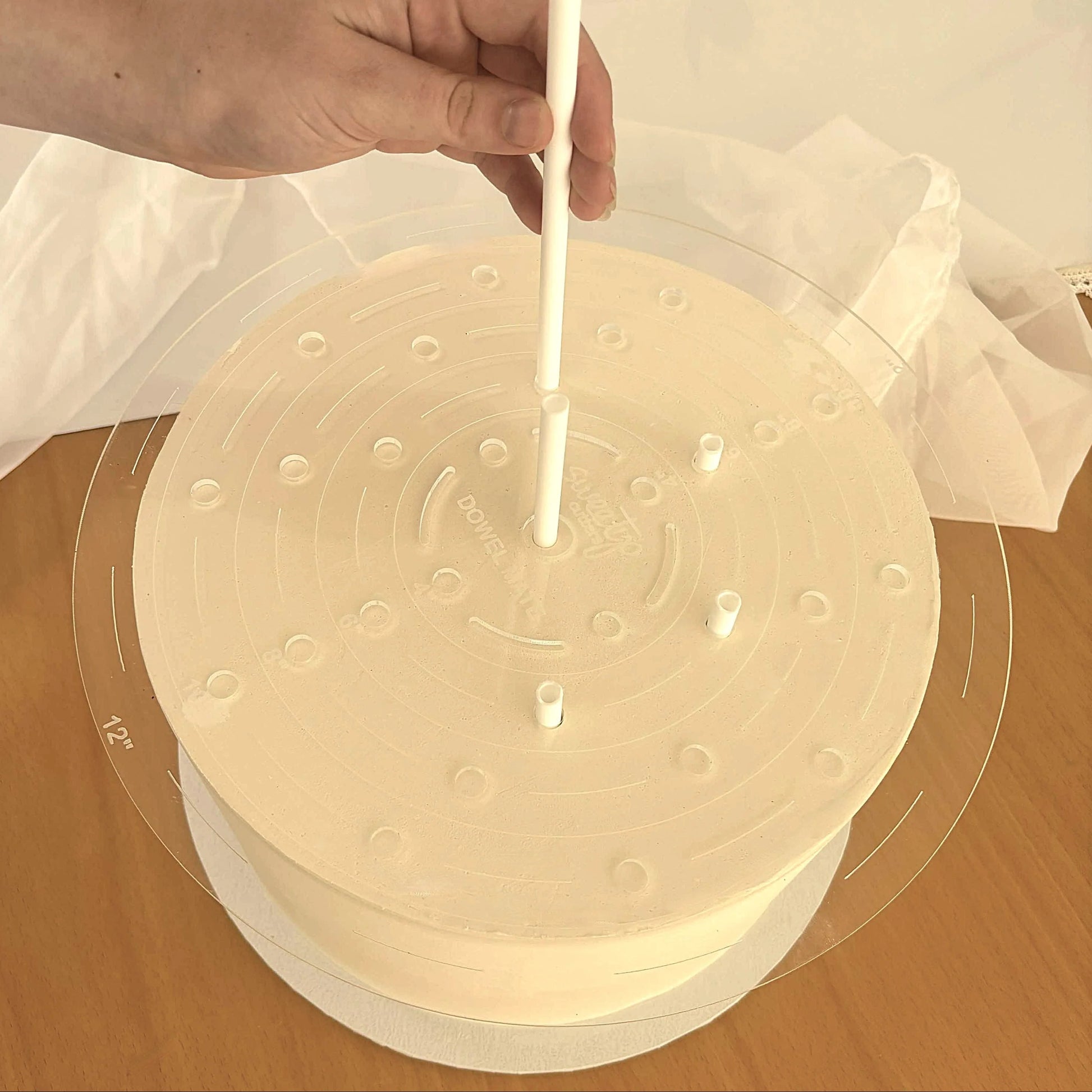 The central hole allows you to find the centre of your cake boards quickly and easily, ready for drilling holes into your cake board. The outer holes help you place your dowels into position easily and guide your hand and dowels straight. Simply place the Dowel Mate on top of your chilled cake and slide the guides into place.