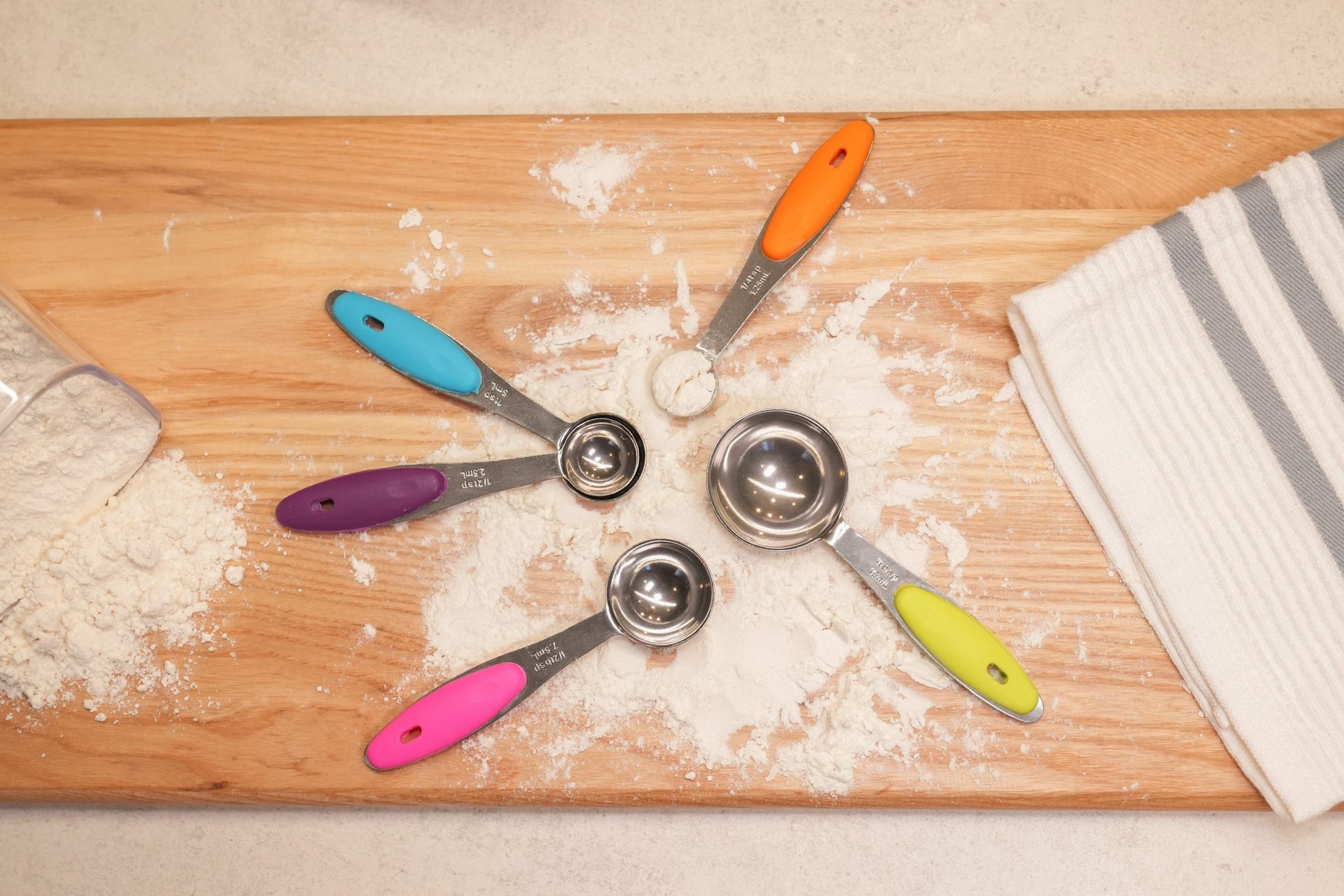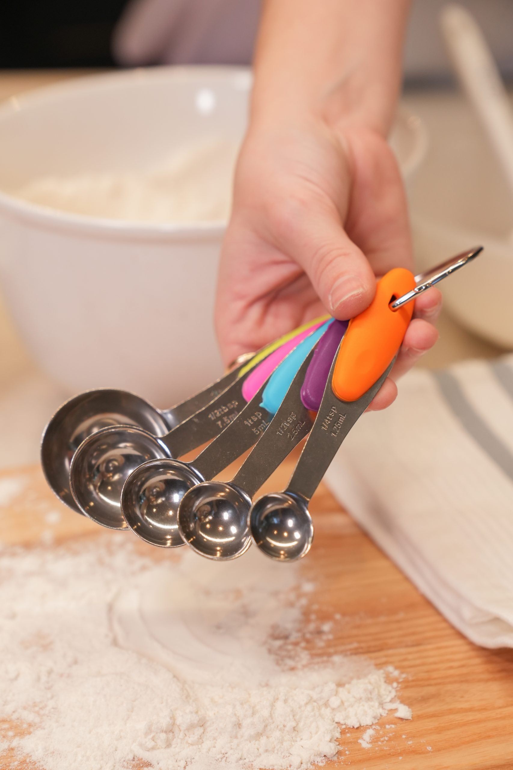 5 piece stainless steel measuring spoons with colourful silicone grip handle.