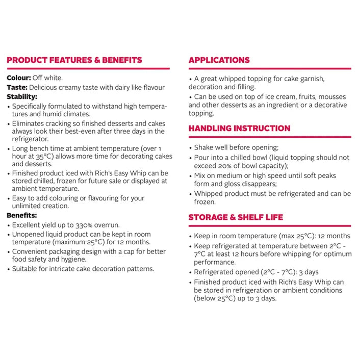 Rich's Easy Whip is a liquid topping that is specifically developed for unparallel handling and storage convenience with ambient shelf life, outstanding yield (3.3L when whipped) and unmatched stability