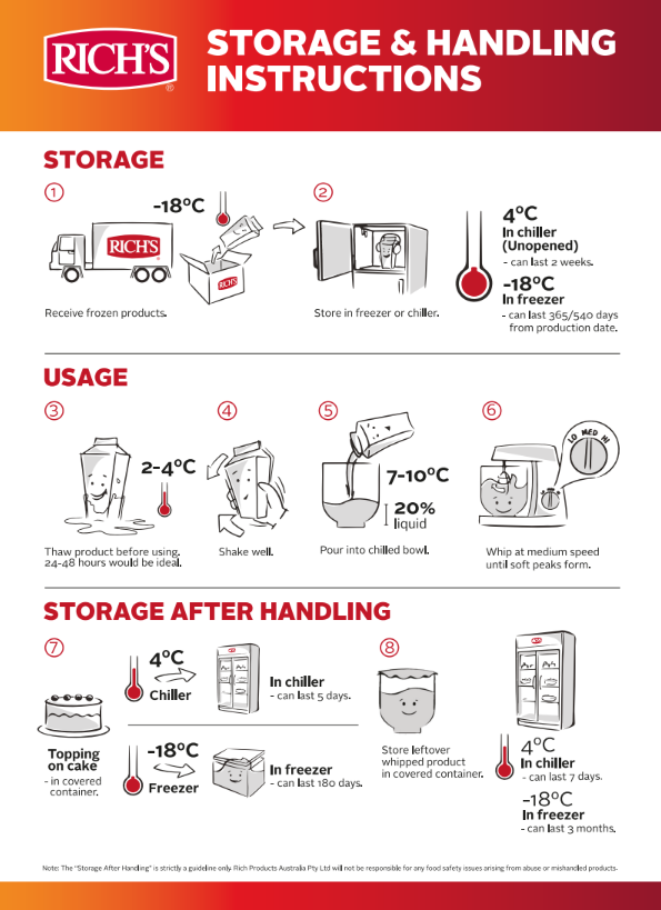 To use, thaw in refrigerator at 2°–7°C for 24-36 hours. Shake container well before opening. Pour into a whipping bowl to about 20-25% of capacity. Incorporate colours, flavours or other ingredients either before whipping or they can be folded in after. Whip the liquid using a wire whisk at medium speed until the product stiffens to your desired consistency. Whip the liquid using a wire whisk at medium speed until the product stiffens to your desired consistency.